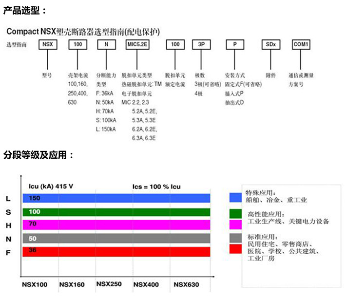 NSX系列塑料外殼式斷路器其額定絕緣電壓為950V,適用于交流50Hz或(60Hz),額定工作電壓690V及以下,額定工作電流12.5A至630A的電流中,用來分配電能,在正常條件下做不頻繁的閉合和斷開之用,并在線路和設(shè)備過載、欠電壓時起保護(hù)作用。額定殼架等級電流在400A及以下的斷路器,也可作鼠籠型電動機(jī)的不頻繁起動,運轉(zhuǎn)中斷開以及在電動機(jī)過載,短路及欠電壓時起保護(hù)作用。